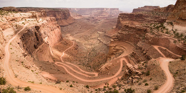 La carretera ubicada en el Parque Nacional Canyonlands (Utah) requiere de dos a tres días de viaje para ser recorrida por completo. El terreno obliga a no desviarse del camino en ningún momento, dado que la seguridad vial es muy limitada.